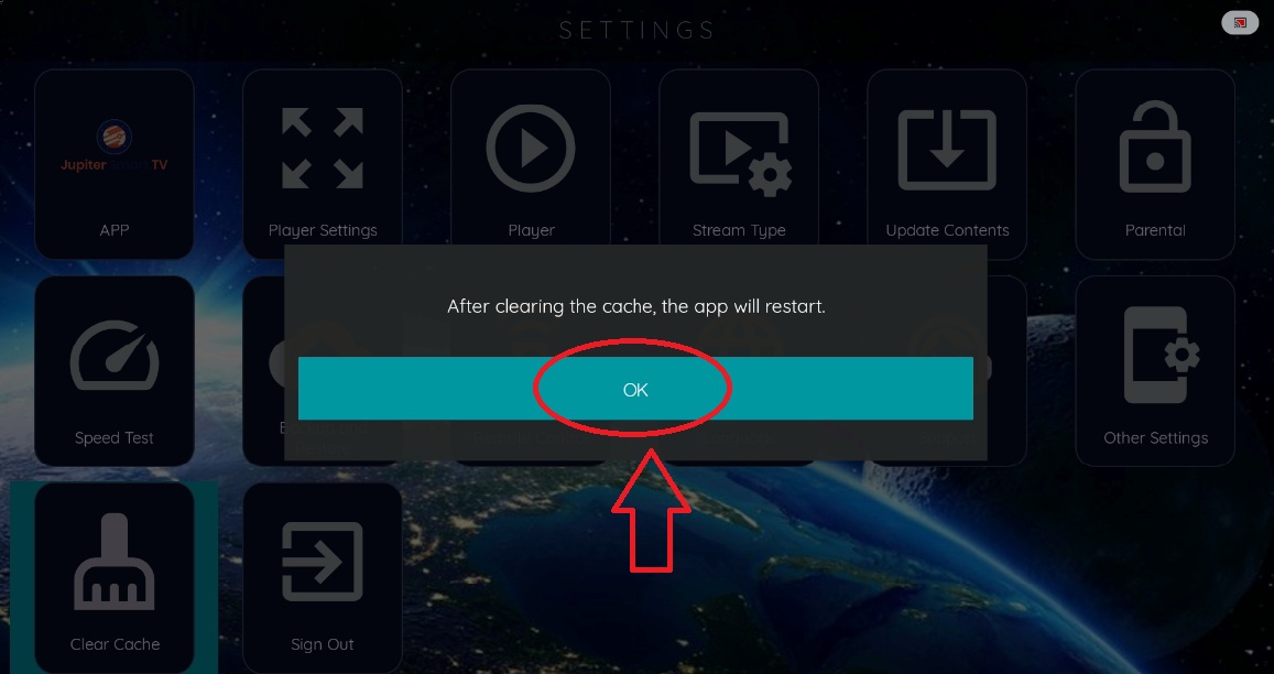 How to Clear Cache On Jupiter Smart Player APP Click on "Settings" As shown below. 2. Then go to "Clear Cache" as shown below 3. Then Select OK and the app will restart